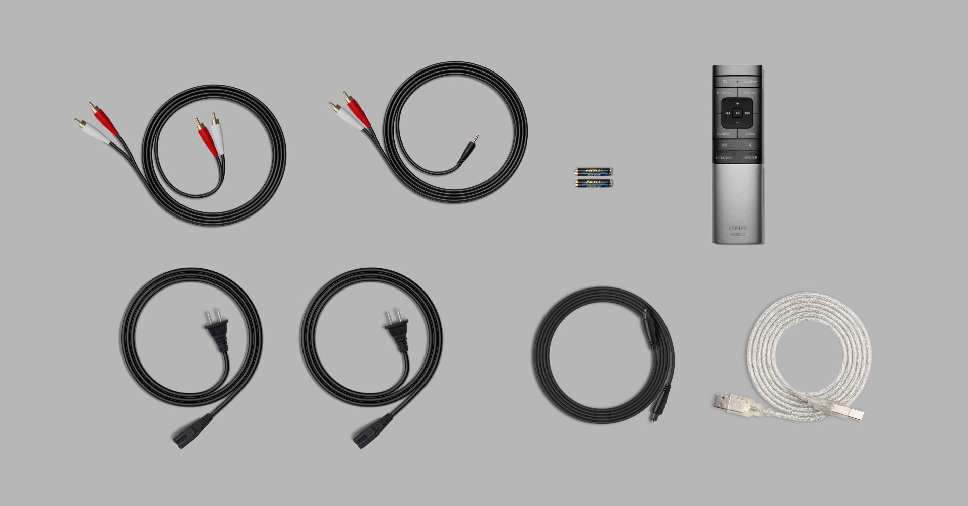 Obsah balení: reproduktory S3000MK II, 3,5 mm AUX – RCA audio kabel, RCA – RCA audio kabel, audio kabel z optických vláken, USB-A to USB-B audio kabel, dálkové ovládání, 2x AAA baterie, 2x napájecí kabel, návod k použití, důležité bezpečnostní pokyny.
