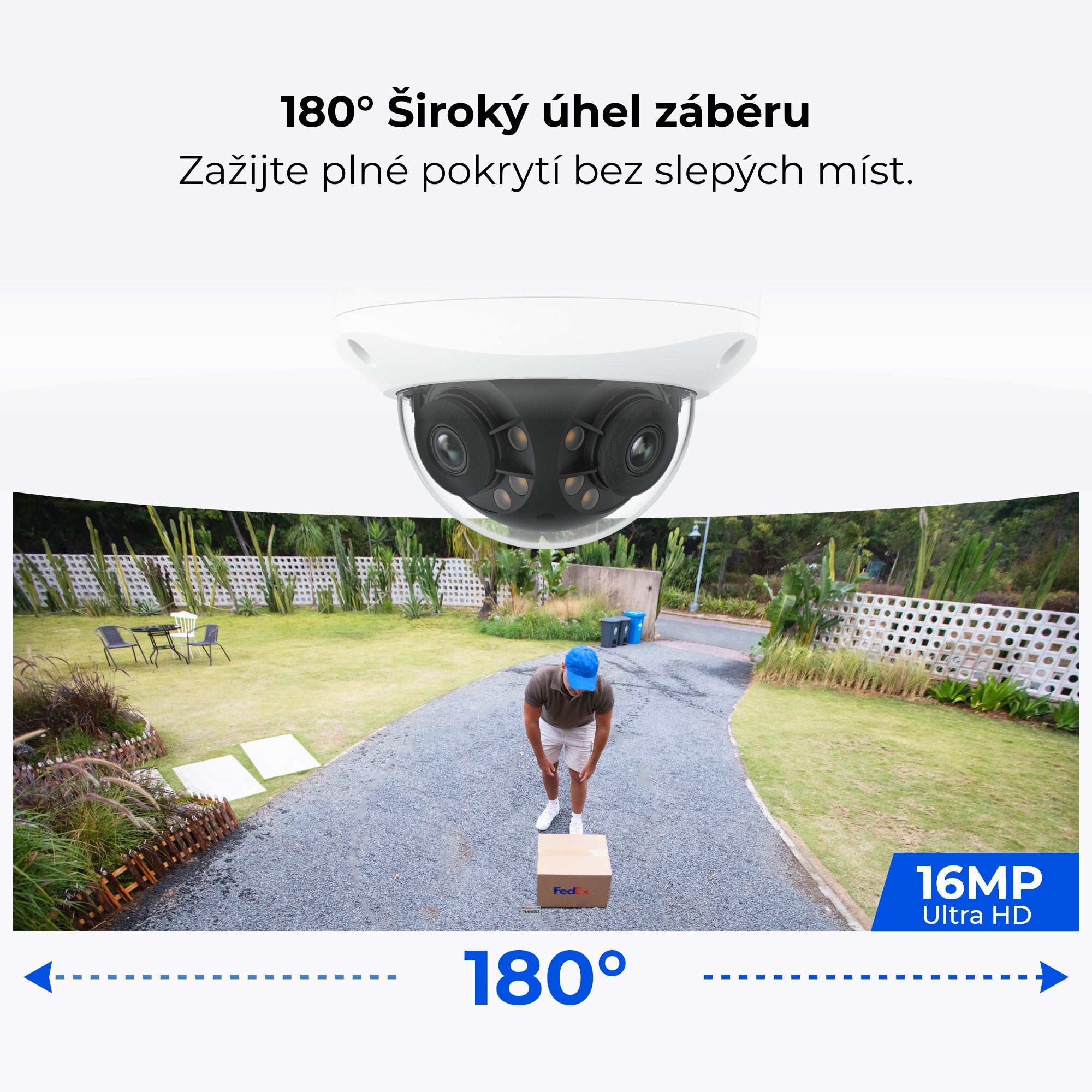 Díky duálním objektivům a technologii spojování obrazu vytváří kamera plynulý 180° panoramatický pohled bez zkreslení. Jedna kamera tak zastane práci dvou – bez slepých míst a bez nutnosti složité instalace více zařízení. Rozlišení 8 MP (4608 x 1728 px) při 20 fps a světelnost F1,6 zajišťují ostré detaily ve dne i v noci.