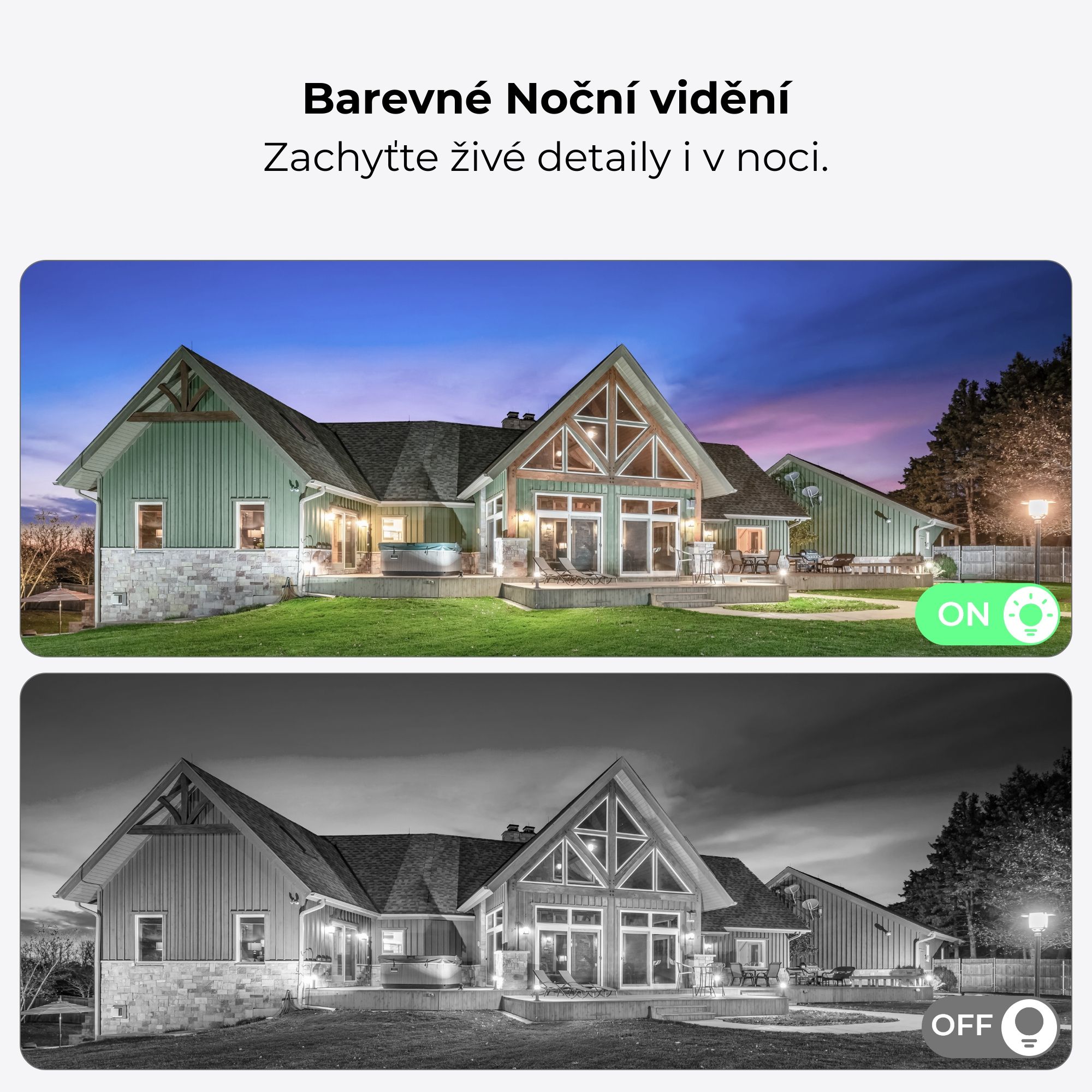 Na výběr máte tři režimy nočního vidění – klasické infračervené (dosah až 30 m), barevné noční vidění s výkonnými reflektory (6x spotlight, 540–840 lumenů) nebo aktivaci barevného režimu pouze při detekci pohybu. Každý detail zůstane zachycen, ať už preferujete diskrétní dohled nebo aktivní osvětlení prostoru.