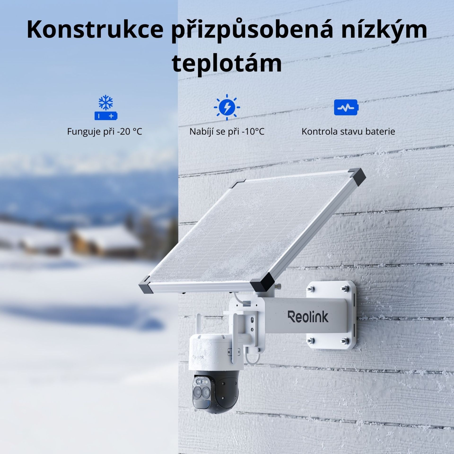 Kamera je vybavena 92Wh RLA-BP1 baterií a vysoce účinným 30W solárním panelem, který zajišťuje stabilní napájení i v extrémních podmínkách. Systém funguje spolehlivě při teplotách až do -20°C, zatímco solární nabíjení je podporováno až do -10°C. To znamená, že můžete kameru používat prakticky kdekoliv, bez obav z výpadku napájení.
