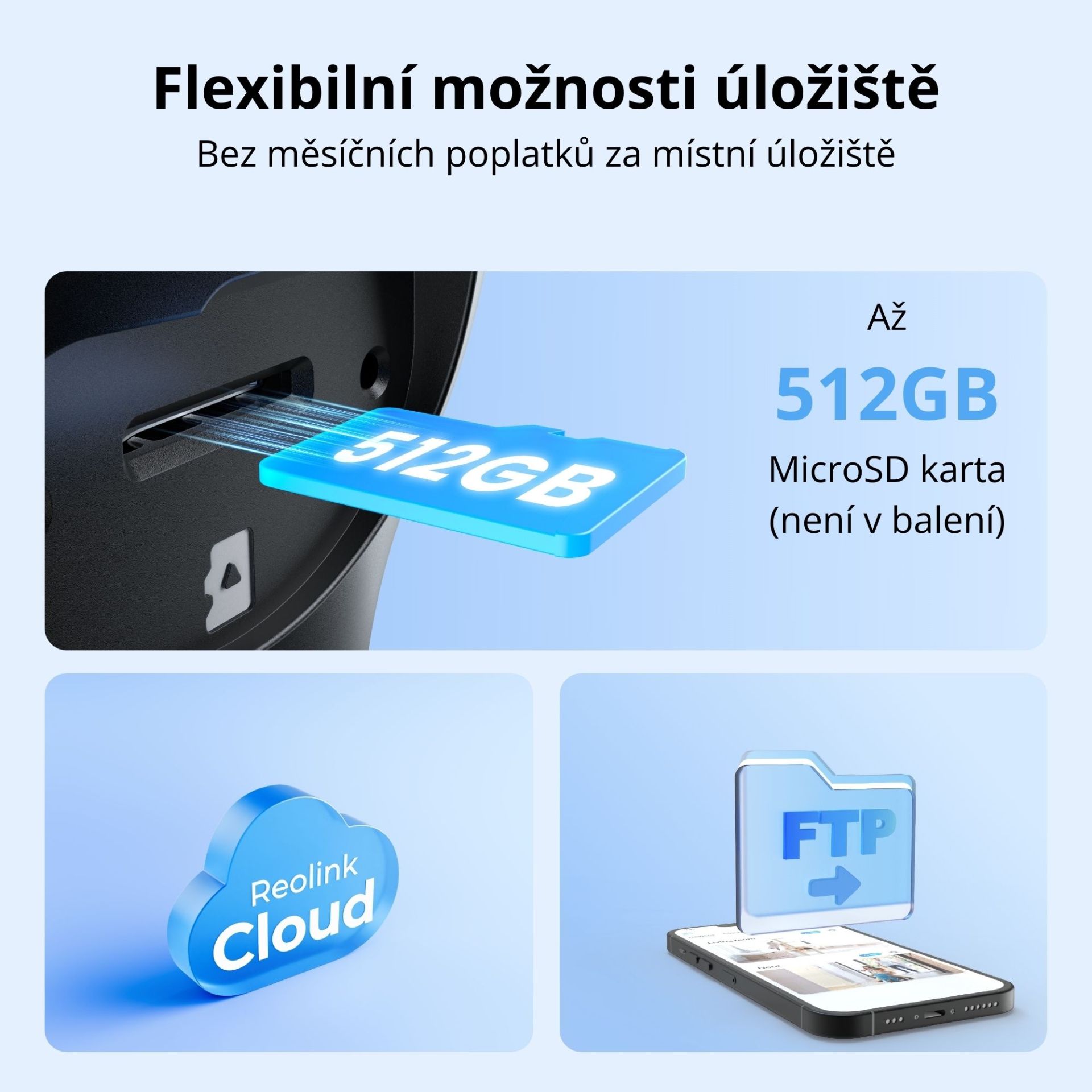 Možnost ukládání videí: microSD karta max. 512GB, Reolink Cloud, FTP server.