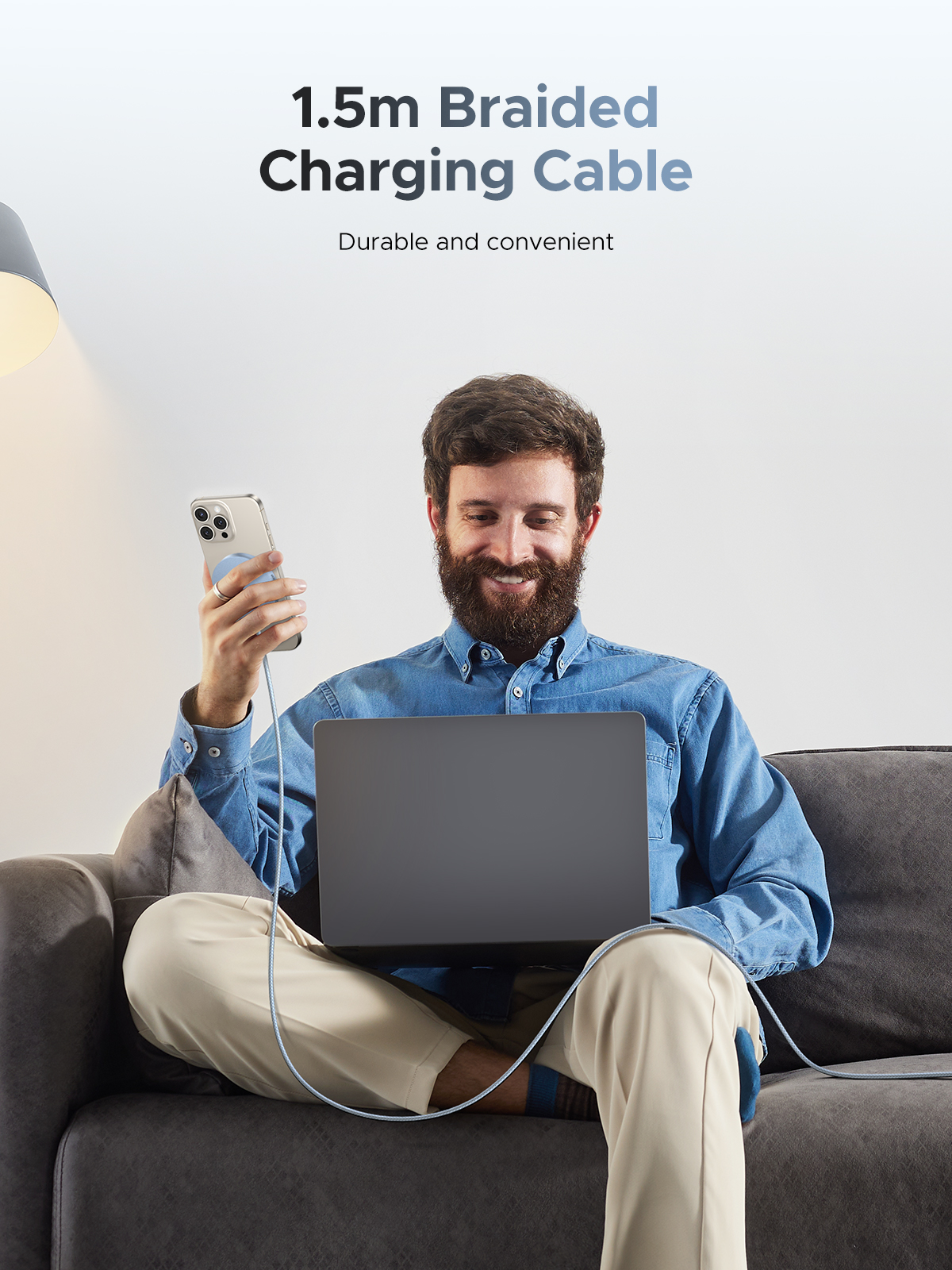 S 1,5 metru dlouhým USB-C kabelem už nejste omezeni zásuvkou. Nabíjejte pohodlně na stole, nočním stolku nebo třeba na gauči. Kabel je navíc odolný a připravený na každodenní používání.