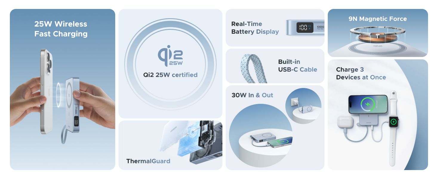 Powerbanka, magnetická, Qi2 - 25W, 10000 mAh, nabíjení 3 zařízení současně, zabudovaný USB-C kabel