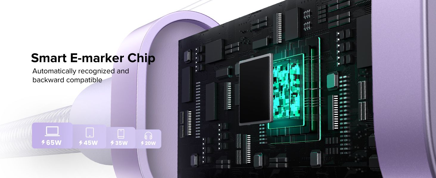 - Vestavěný E-marker čip automaticky rozpozná vaše zařízení a přizpůsobí nabíjecí výkon. Chrání vaše zařízení před přepětím, přehřátím i zkratem.