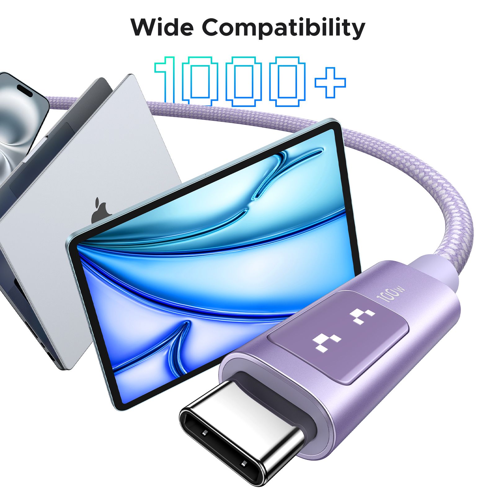 Rychlonabíjecí kabel, 2m, USB-C na USB-C, 100W, 480 Mbps, LED display, fialowý